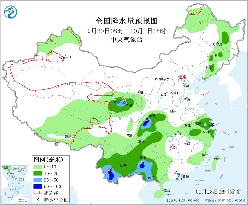 图6 全国降水量预报图(9月30日08时-10月1日08时)