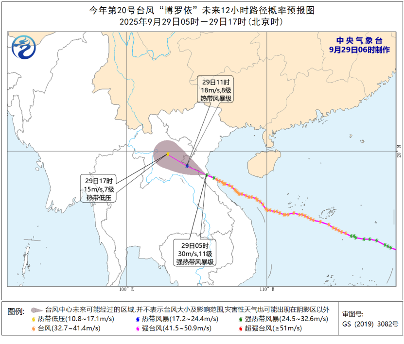 今年第20号台风“博罗依”的中心已于29日1点30分前后在越南河静省沿海登陆,登陆时中心附近最大风力有11级(30米/秒),中心最低气压为980百帕。早晨5点钟“博罗依”的中心位于越南河静省境内,中心附近最大风力有11级(30米/秒),中心最低气压为980百帕,七级风圈半径220~250公里,十级风圈半径60~80公里。预计,“博罗依”将以每小时25~30公里的速度向西偏北方向移动,强度快速减弱(见图1)。29日08时至30日08时,南海西部、西沙群岛附近海域、北部湾、琼州海峡、广东西部沿海、海南岛及沿海、广西沿海将有6~8级、阵风9~10级的大风,其中,北部湾偏南海域的风力有9~10级、阵风11~12级(见图2)。中央气象台9月29日06时发布台风蓝色预警。