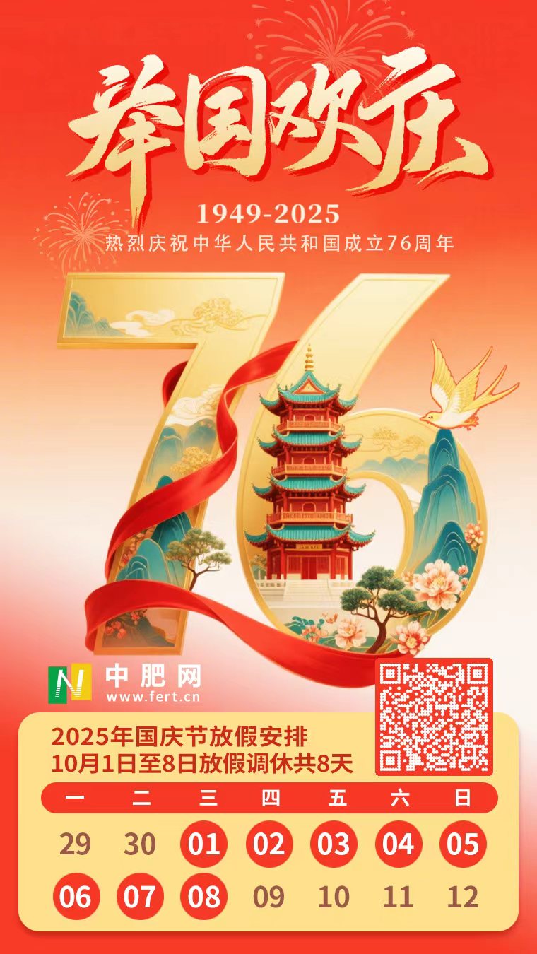 【放假通知】根据国务院办公厅发布的有关通知,中肥网于2025年10月1日-8日放假共8天,在此期间网站稿件,微信公众号正常更新。10月9日(星期四)起恢复正常,由此给您带来的不便,敬请谅解!中肥网祝广大新老客户国庆中秋节快乐!