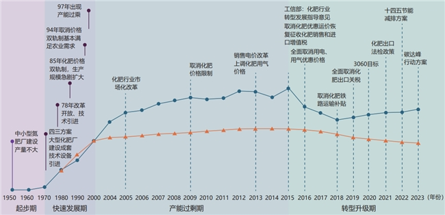中国化肥产业自1949年新中国成立后,经历了起步、快速发展、产能过剩和转型升级四个发展阶段(如图1)。21世纪初,中国成为了全球最大氮肥生产与消费国,但产能过剩问题日益突出。为此,国家推进市场化改革,逐步取消电价等优惠政策,并于2015年恢复征收化肥销售和进口增值税,以优化供给结构。2015年后,工信部发布《推进化肥行业转型发展的指导意见》,推动行业绿色转型。中国“双碳”目标提出后,“十四五”规划进一步明确了氮肥行业低碳发展路径,推动产业向集约化、智能化、低碳化的新阶段加速转型。