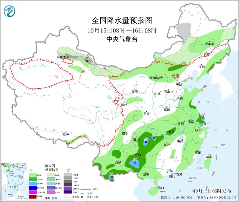 10月15日08时至16日08时,新疆沿天山地区、内蒙古东部和西部、甘肃西北部、黑龙江东部等地有小到中雪或雨夹雪,新疆沿天山地区东部局地有大雪;内蒙古中部、华北北部、黄淮东部、江淮、江汉、江南北部和东部、西南地区东部和南部、华南西部和东部等地部分地区有小到中雨,其中,江苏东南部、重庆东南部、湖南西北部、贵州东北部和西南部、广西西北部、云南南部等地部分地区有大雨(25~45毫米)。内蒙古西部、新疆东部和南疆盆地等地部分地区有4~6级风(见图1)。