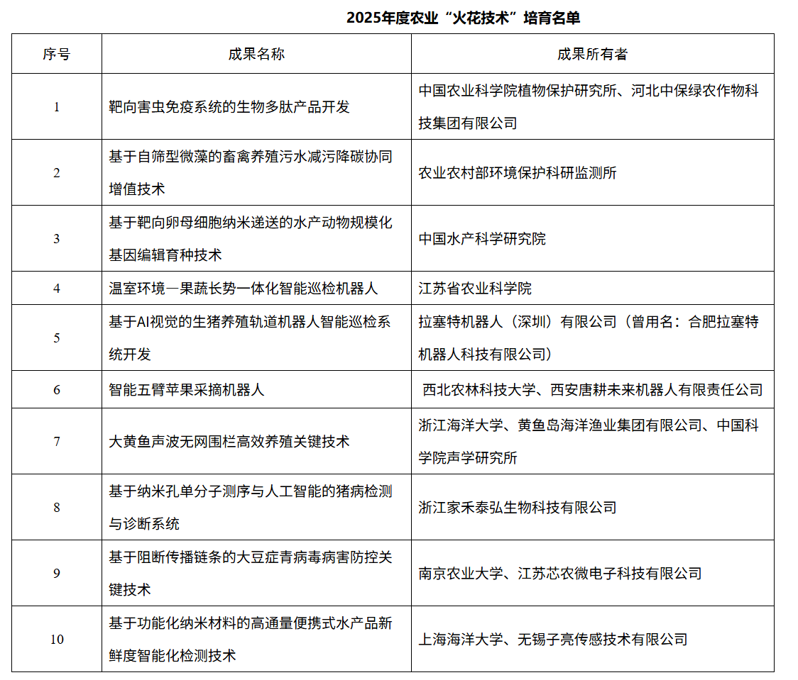 农业农村部发布2025年度农业“火花技术”名单