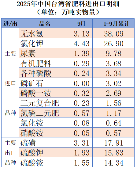 2025年1-9月台湾省累计进口量超过5000吨的肥料及原料有11个(具体见下表)。其中,累计进口无水氨38.09万吨,氯化钾26.90万吨,尿素9.78万吨,各种磷酸3.34万吨,氯化铵0.64万吨。