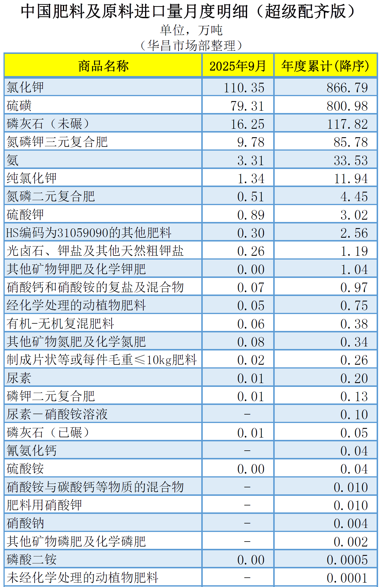 2025年1-9月,中国进口量排在前5位的肥料及原料品种:①除纯氯化钾外其他氯化钾866.79万吨,②硫磺800.98万吨,③磷灰石(未碾)117.82吨,④氮磷钾三元复合肥85.78万吨,⑤氨33.53万吨。
