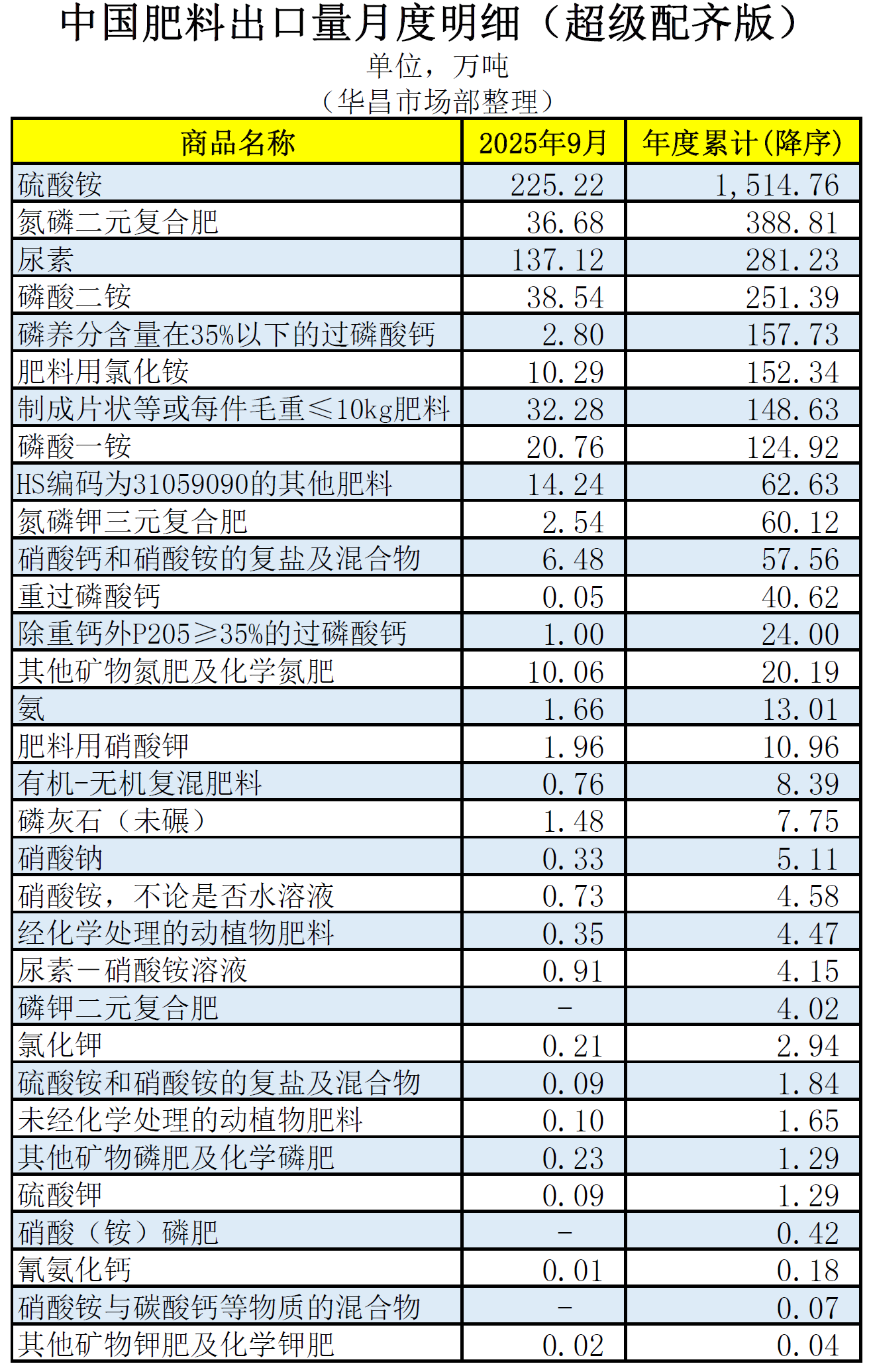2025年9月当月,中国出口量排在前5位的肥料品种:①硫酸铵225.22万吨,②尿素137.12万吨,③磷酸二铵38.54万吨,④氮磷二元复合肥36.68万吨,⑤10公斤以下小包装肥料32.28万吨。