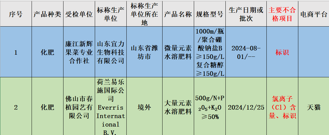 在关于化肥的抽检中,本次抽查发现不合格产品2款(其中天猫1款)。不合格项目为:标识、氯离子(Cl)含量。