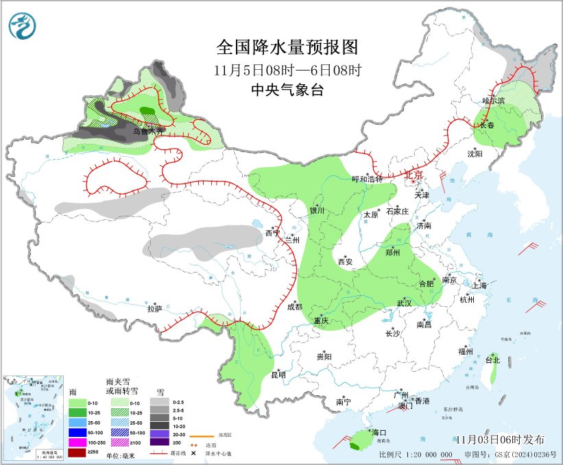 11月5日08时至6日08时,新疆北部、东北地区东部、青海中部等地部分地区有小到中雪或雨夹雪,其中,新疆阿勒泰、沿天山一带等地部分地区有大到暴雪(10~15毫米),新增积雪深度6~10厘米,部分地区15~20厘米。内蒙古西部、西北地区东部、黄淮西部、江淮西部、江汉、西南地区东北部和西南部、海南岛等地部分地区有小雨,局地有中雨。南海东南部海域将有10~12级、阵风13级的风,南海西南部海域将有10~11级、阵风12级的风,南海中部海域将有6~8级、阵风9级的风(见图5)。