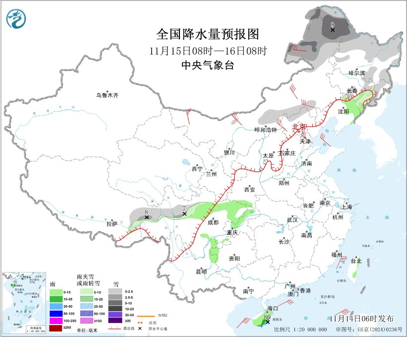 图1 全国降水量预报图(11月14日08时-15日08时)