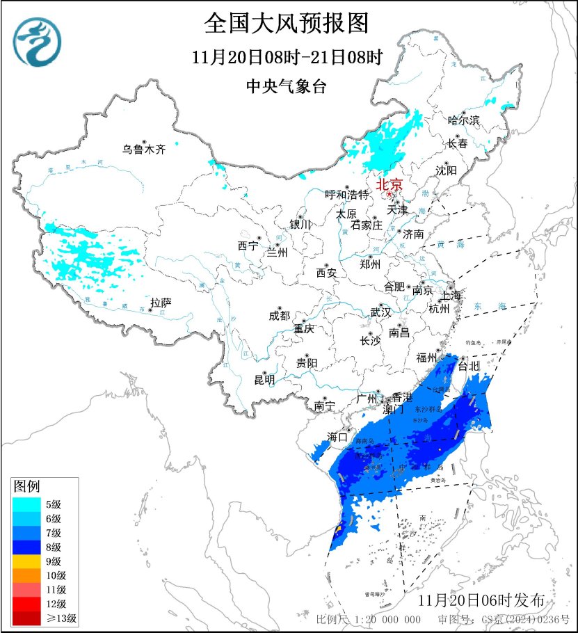 预计,11月20日08时至21日08时,内蒙古中东部、西藏西部等地部分地区将有5~6级风,阵风7~8级;台湾海峡、台湾以东洋面偏南海域、巴士海峡、南海北部和中部海域、南海西南部偏西海域将有7~8级、阵风9~10级的大风(见图1)。中央气象台11月20日06时继续发布大风蓝色预警。