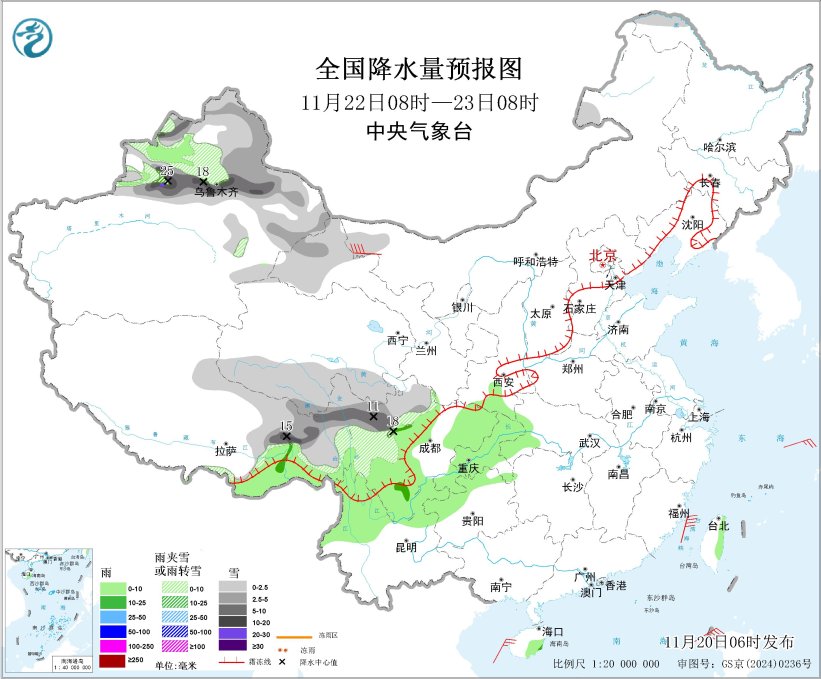 11月22日08时至23日08时,新疆北部和东部、甘肃西北部、青海南部、西藏东部、川西高原中北部等地部分地区有小到中雪或雨夹雪,其中,新疆沿天山地区和伊犁河谷、西藏东部、川西高原北部等地部分地区有大到暴雪,局地大暴雪(20~25毫米)。新疆伊犁河谷、西藏东南部、陕西南部、川西高原南部、云南北部、四川盆地东部和南部、贵州西部、重庆等地部分地区有小雨,局地有中雨。内蒙古西部、甘肃北部等地部分地区有5~7级风、阵风8~9级;南海北部和中部等部分海域将有5~7级风、阵风8级(见图4)。