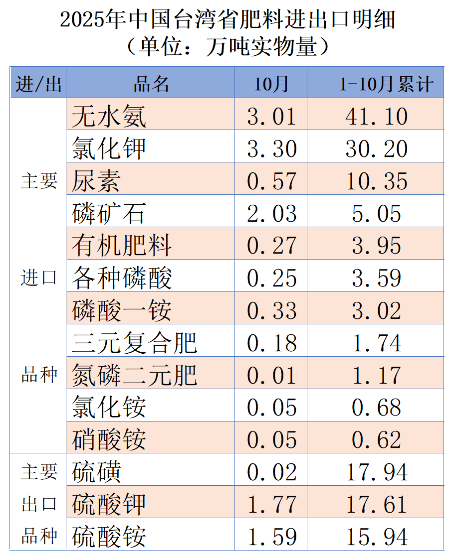 2025年1-10月台湾省累计进口量超过5000吨的肥料及原料有11个(具体见下表)。其中,累计进口无水氨41.10万吨,氯化钾30.20万吨,尿素10.35万吨,各种磷酸3.59万吨,氯化铵0.68万吨。