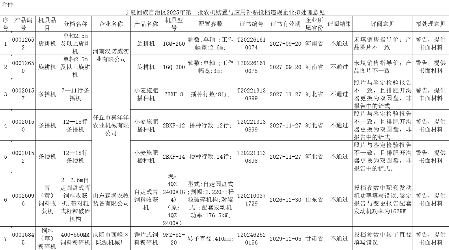 附件:宁夏回族自治区2025年第三批农机购置与应用补贴投档违规企业拟处理意见